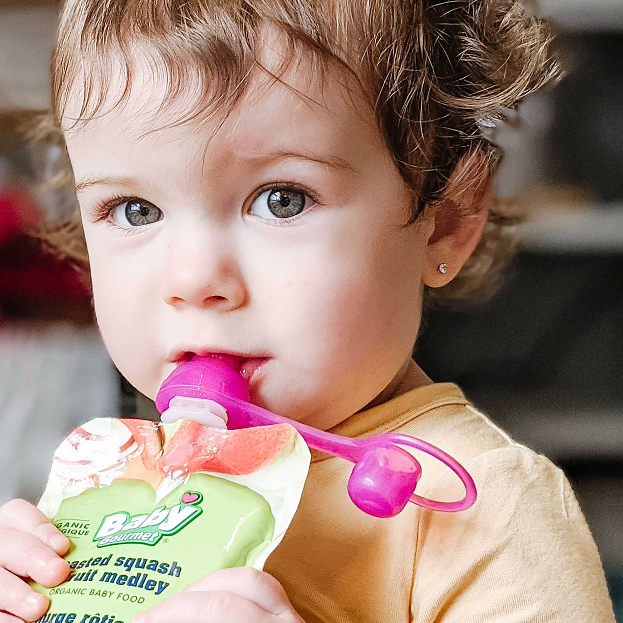 Konečne kŕmenie bez nehôd a obmedzení! Teraz už aj v balení s cestovným puzdrom, aby ste náustky nikdy nestratili. Kŕmenie z kapsičky už nikdy nebude bolestivé pre citlivé detské ďasná a zúbky. Konečne môže vaše dieťa pohodlne hrýzť pri maškrtení. SoftSip je jemný silikónový náustok, ktorý je navrhnutý tak, aby úplne zakryl plastové vyústenie kapsičky. Vďaka tomu budú mať deti úplne iný zážitok z kŕmenia z kapsičky. Membrána náustka navyše chráni obsah kapsičky pred náhodným vyliatím alebo vytlačením. Pripojte ho jednoducho ku kapsičke a opakovane používajte. ChooMee SoftSip je vhodný na jednorazové kapsičky ako aj na kapsičky na opakované použitie. S membránou a vrchnákom. Vyrobený z vysokokvalitného jemného silikónu. Neobsahuje BPA, PVC, olovo a ftaláty. Vhodné na všetky balenia príkrmov balených v kapsičke. Pre deti od 6 mesiacov. Použitie: Otvorte kapsičku, nasaďte náustok na vyústenie kapsičky, silno zatlačte až kým nezačujete kliknutie. Pred a po použití náustok dôkladne umyte. Nepoužívajte pri tom ostré predmety, ktoré by mohli membránu poškodiť. Možno umývať v umývačke riadu a sterilizovaním. Deti nenechávajte pri kŕmení bez dozoru. Pred každým použitím náustok skontrolujte a v prípade opotrebovania alebo poškodenia vymeňte za nový. Vyhovuje normám EN 14350.