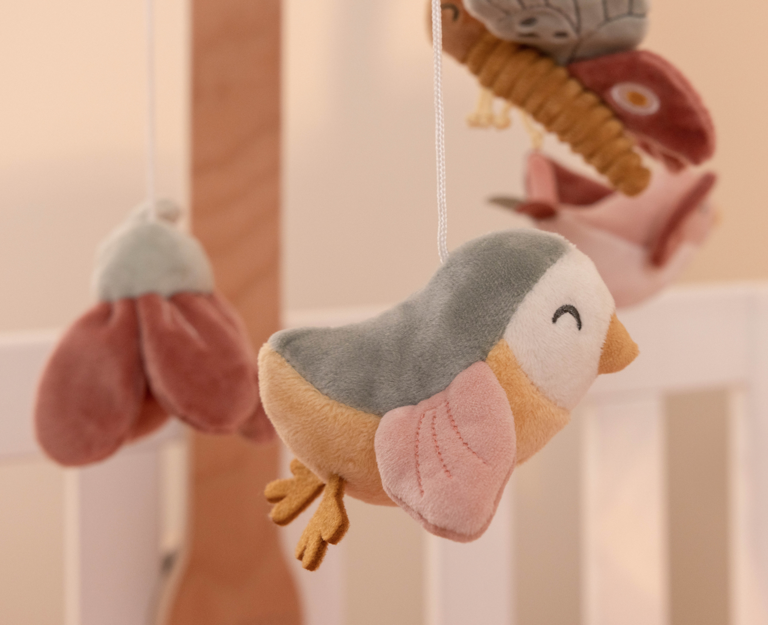 Krásny drevený kolotoč z kolekcie hračiek Little Dutch Kvety a motýle hrá po natiahnutí uspávanku na upokojenie vášho bábätka pred spaním. Pozornosť dieťaťa upúta päť otáčajúcich hračiek v podobe vtáčikov, kvetov a motýľa.