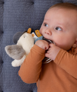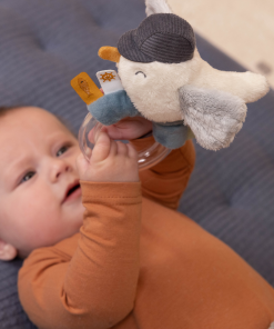 Originálna hrkálka v podobe priehľadného krúžku s hrkajúcimi korálkami a plyšovej čajky z kolekcie Námornícky záliv je ideálna ako prvá hračka pre vaše bábätko. Hrkálka má tvar pre ľahké uchopenie a rôznorodé textúry na skúmanie rukami i ústami. Krídla čajky pri stlačení šuštia.