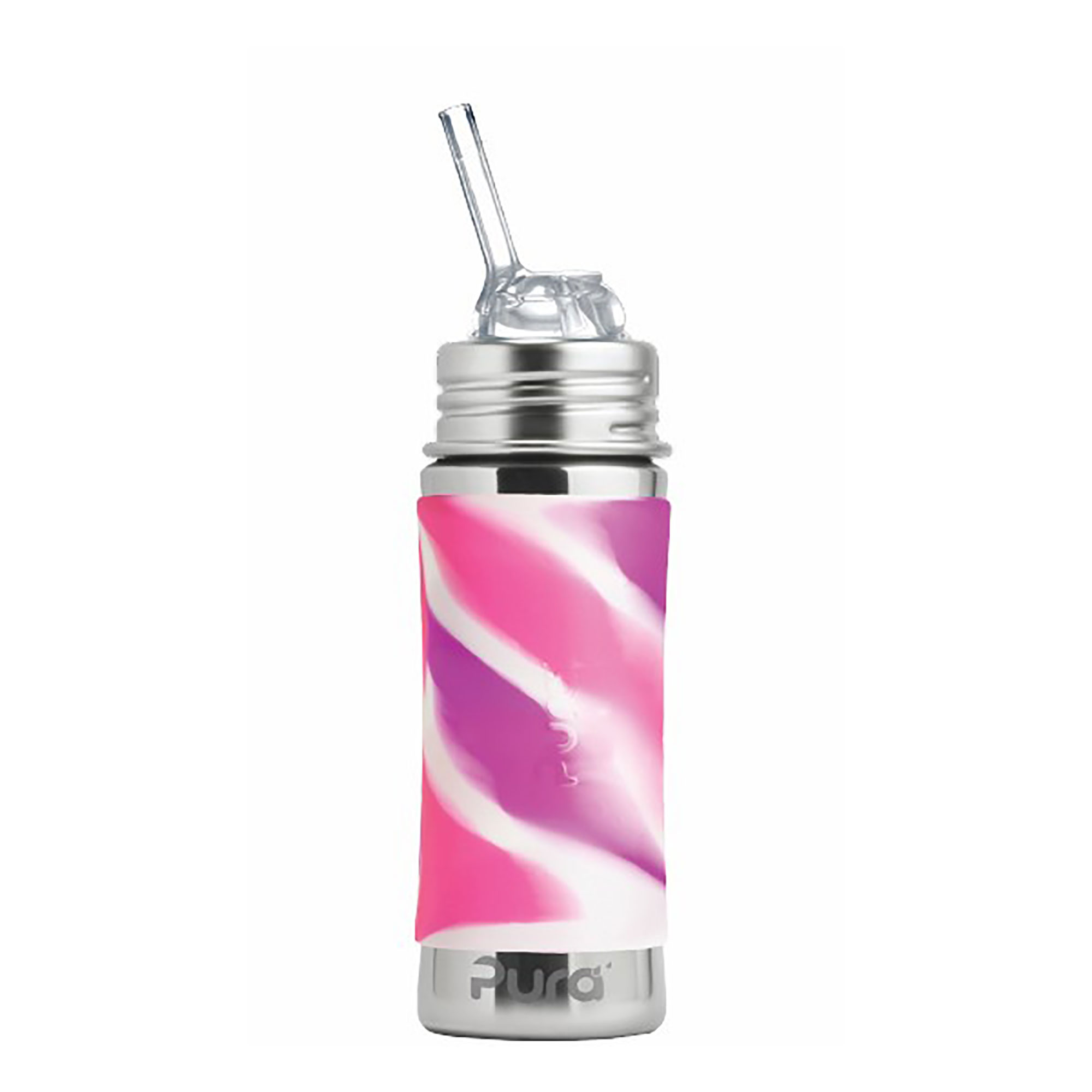 Konečne bezpečná fľaša vyrobená 100% bez plastových častí. S Pura fľašami si môžete byť istí, že sa do nápoja vnútri neuvoľňujú žiadne škodlivé látky a toxíny, ani príchute a pachy ako je tomu u plastových fliaš alebo fliaš s plastovými vrchnákmi. Na ničom nezáleží viac ako na zdraví vašich detí a vás. Pura slamka má voľný prietok bez membrány. Je vyrobená zo 100% silikónu medicínskej kvality. Slamka je zložená z dvoch častí, vďaka čomu je možné piť z fľaše dvomi spôsobmi: Použitím oboch častí možno sať slamkou bežným spôsobom (fľaša vo zvislej polohe). Odobratím spodnej časti slamky možno piť z fľaše rovnako ako s použitím náustka (fľaša naklonená hore dnom). Any Bottle… Any Lid TM – patentovaný systém umožňuje použiť akúkoľvek Pura fľašu s akýmkoľvek Pura uzáverom. Baby Grows… Bottle Evolves TM – Pura fľaše sa prispôsobujú a “rastú” s vaším dieťaťom. Nekupujte zakaždým novú fľašu. Jednoducho zmeňte dojčenskú fľašu na fľašu s náustkom alebo so slamkou a neskôr so športovým uzáverom, či športovou slamkou tak, že vymeníte len silikónovú časť. Môžete tak jednu fľašu používať mnoho rokov a šetrite tak peniaze aj prírodu. Žiadne plasty – žiadne obavy o bezpečnosť. Najbezpečnejšia, najuniverzálnejšia, ľahká a nerozbitná ekologická fľaša ocenená viac ako 35 oceneniami. Prvá fľaša na trhu 100% bez plastových častí a jediná fľaša, ktorá získala certifikát Made Safe® potvrdzujúci bezpečnosť použitých materiálov vysoko nad rámec legislatívnych požiadaviek. Fľaša a objímka sú vyrobené z prvotriednej potravinárskej nerezovej ocele triedy 304 (18/8) a ostatné časti zo silikónu najvyššej medicínskej kvality. Bez BPA, PVC, ftalátov a bez akýchkoľvek iných nebezpečných látok a toxínov, testované podľa smerníc EÚ. Mierka na vnútornej strane pre pohodlné a presné dávkovanie. Objem celkom: 325 ml. Balenie obsahuje: nerezovú fľašu 325 ml, nerezovú objímku, silikónovú slamku, silikónový vrchnák, silikónový návlek, kefku na čistenie slamky. 325 ml fľaša nemá vákuovú izoláciu a neslúži ako termoska. Nepoužívajte na vriace alebo sýtené nápoje, pretože sila pary resp. bubliniek by mohla vytlačiť tekutinu cez slamku von. V prípade použitia horúceho nápoja sa steny fľaše rýchlo nahrejú a môžu na dotyk páliť. Vhodné do umývačky riadu.