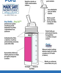 Konečne bezpečná fľaša vyrobená 100%25 bez plastových častí. S Pura fľašami si môžete byť istí, že sa do nápoja vnútri neuvoľňujú žiadne škodlivé látky a toxíny, ani príchute a pachy ako je tomu u plastových fliaš alebo fliaš s plastovými vrchnákmi. Na ničom nezáleží viac ako na zdraví Vašich detí a Vás. Kvalitná vákuová termoizolácia udrží tekutinu teplú až 6 hodín a studenú až 24 hodín (s ľadom). Pura fľaše sa navyše prispôsobujú a “rastú” s Vašim dieťaťom. Jednoduchou výmenou uzáverov sa fľaša mení z dojčenskej fľaše na fľašu s náustkom, slamkou alebo športovým uzáverom či na pohárik na príkrmy a občerstvenie. Môžete tak jednu fľašu používať mnoho rokov. One Life… One Bottle™. Najbezpečnejšia, najuniverzálnejšia, ľahká a nerozbitná ekologická fľaša ocenená viac ako 35 oceneniami. Prvá fľaša na trhu 100%25 bez plastových častí a jediná fľaša, ktorá získala certifikát Made Safe® . Vákuová termoizolácia udrží tekutinu teplú až 6 hodín a studenú až 24 hodín (s ľadom). Baby Grows… Bottle Evolves™ – patentovaný systém umožňuje použiť akúkoľvek Pura fľašu s akýmkoľvek Pura uzáverom. Jednoducho tak zmeníte dojčenskú fľašu na fľašu s náustkom, slamkou, alebo športovým uzáverom alebo s použitím tesniaceho disku na pohárik na príkrmy a drobné občerstvenie. Jednu fľašu tak môžete používať roky a zároveň šetríte peniaze aj životné prostredie. Fľaša a objímka sú vyrobené z prvotriednej potravinárskej nerezovej ocele triedy 304 (18/8) a ostatné časti zo silikónu najvyššej medicínskej kvality. Bez BPA, PVC, ftalátov a bez akýchkoľvek iných nebezpečných látok a toxínov, testované podľa smerníc EÚ. Pura slamka je vyrobená zo 100%25 silikónu medicínskej kvality. Slamka je zložená z dvoch častí, vďaka čomu je možné piť z fľaše dvomi spôsobmi: Použitím oboch častí možno sať slamkou bežným spôsobom (fľaša vo zvislej polohe). Odobratím spodnej časti slamky možno piť z fľaše rovnako ako s použitím náustka (fľaša naklonená hore dnom). Fľaša je kompatibilná s cumlíkmi/náustkami mnohých iných značiek. Mierka na vnútornej strane pre pohodlné a presné dávkovanie. Súčasťou je silikónový vrchnák chrániaci cumlík a vymeniteľný farebný silikónový návlek na fľašu pre lepšie uchopenie a izoláciu. Nevhodné do umývačky riadu. Pre zachovanie termo-izolačných vlastností odporúčame fľašu umývať ručne. Nesterilizovať. Doživotná zaruka na časti z nerezovej ocele. Nevzťahuje sa na mechanické poškodenie fľaše. Váha: 182g Rozmery: 5,7 x 19,6cm Balenie obsahuje: nerezovú fľašu s vákuovou termoizoláciou 260ml, nerezovú objímku, silikónovú netečúcu slamku, silikónový návlek a vrchnák